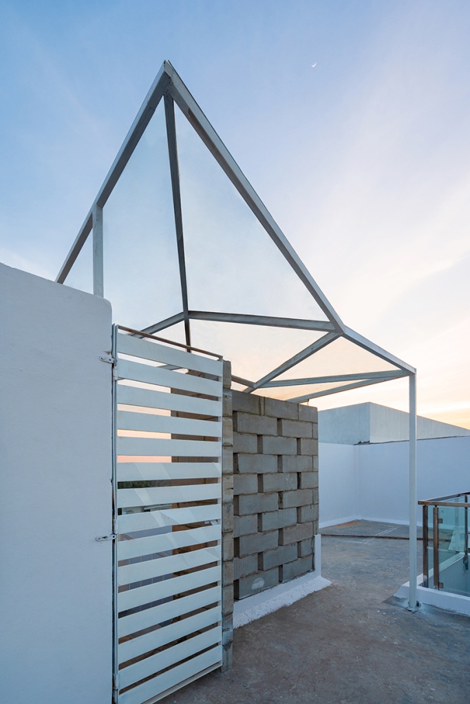 The spatial layout forms around the atrium. A perforated light-weight concrete block wall is designed in the shared space with the neighboring house ensuring privacy and ventilation. The Peekaboo wall uses computational design in an intricate play with angles of rotation of each concrete block creating an undulating geometric surface. The reinterpreted jaali skin over the front facade provides access to the greenery in the front yard through the internal balconies and large bedroom windows, while securing privacy from the lane. White ribbons of folded steel cover the origami-like facade and wrap around the side of the house, casting fractured shadows and allowing strips of light to cast on the walls and floor.