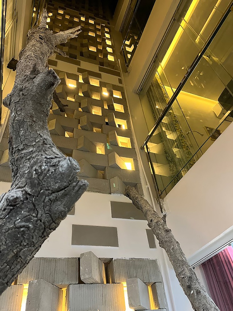 The practice of repetition and patterns is evident throughout the design. At every level, the front bedroom headboards are customized to reflect the folds of the facade at that level, while the master bedroom arranges a larger tufted headboard that mimics the grid of the Peekaboo wall. Opposite to the sleeping zone is Fold, an origami-like foldable partition between the master bedroom and the dressing area. Due to limited area, several space-saving measures are adopted in this house, such as built-in wardrobes and convertible side tables in the front bedrooms.
