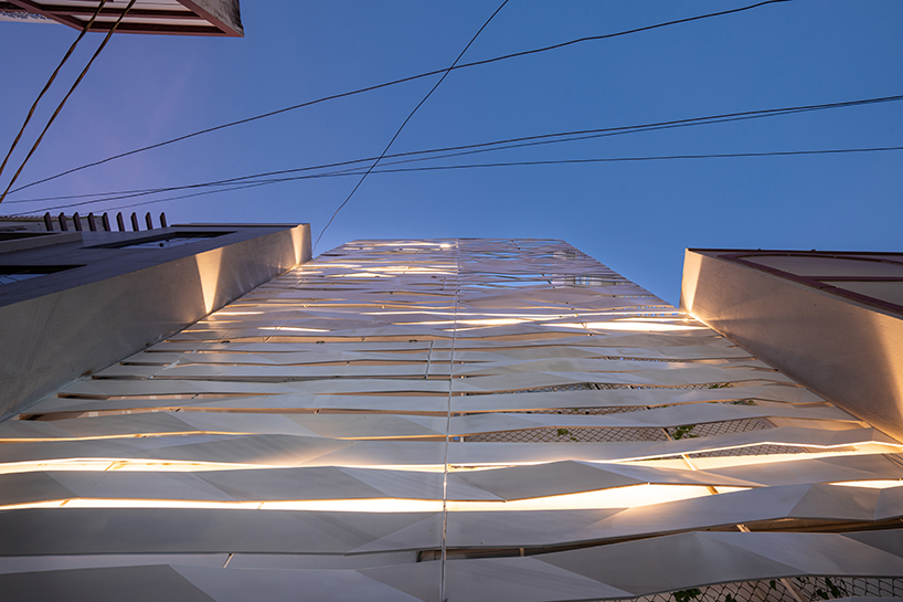 he ‘ribbonesque’ facade is designed through various iterations of paper folding and cutting, creating an interrupted and intersecting folded surface. The steel bands explore folding as a means of fabrication. The screen allows residents to view the lane while restricting visual access to the interior from passers-by. On the upper levels, balconies from the front bedroom overlook the internal front garden and the lane. Hydraulic-operated shutters on each level allow for balconies to open up toward the lane or remain closed, creating a dynamic facade. The design team proposes the adornment of the metal strips with flowering vines and the plantation of the rooftop garden over time.