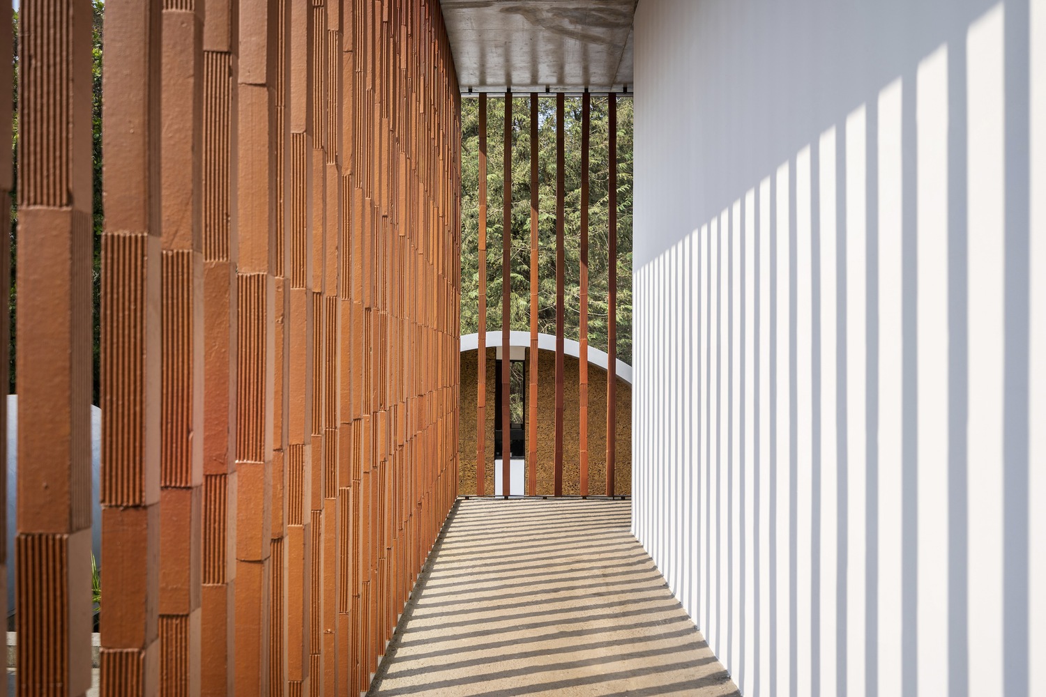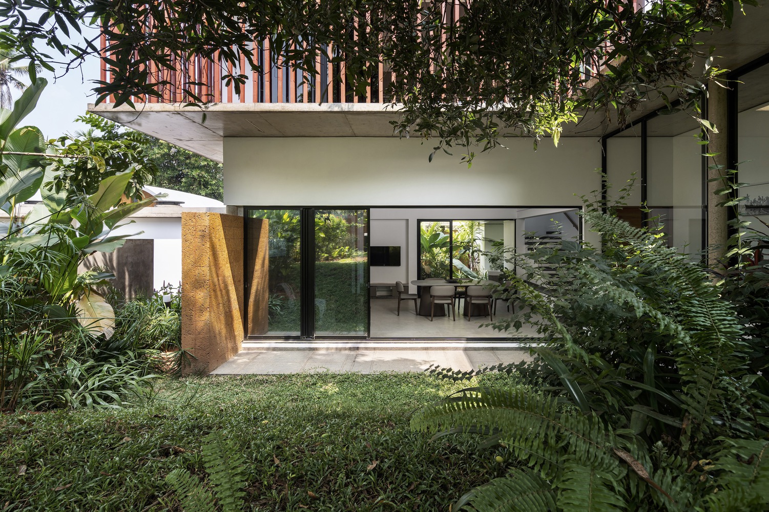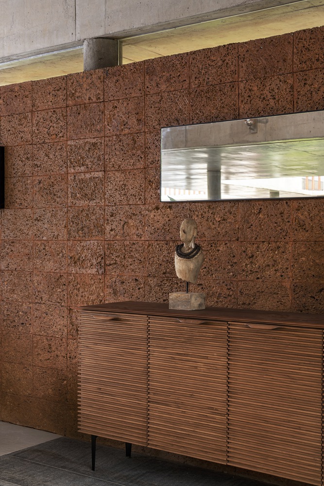 The conveniently located staircase at the main block’s entry provides access to the upper floor. This floor includes the entertainment room, which also functions as a family space, and the master bedroom, which extends into a semi-open lounge area and incorporates a dressing area along with a toilet. The first floor, exposed to the elements, is wrapped in a protective screen crafted from thin fluted terracotta blocks that are elegantly slid onto a vertical metal tube framework. This screen envelops the entire first floor, shielding it from the intense sun and rain while also offering a private passage accessible from every room.